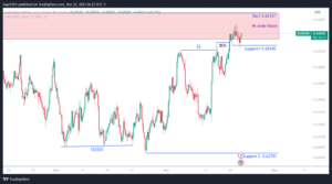 كما نرى في الرسم البياني الموضح ارتد السعر من منطقة H4 order block و انتهى من الحركة التصحيحية الصاعدة و نتوقع المزيد من الهبوط خلال الأسبوع بعد كسر الدعم القريب والاغلاق تحت مستويات 0.65345 ولكن اذا قام السعر بكسر المقاومة القريبة 0.66167 سيتحول الاتجاه الرئيسي الى صعود