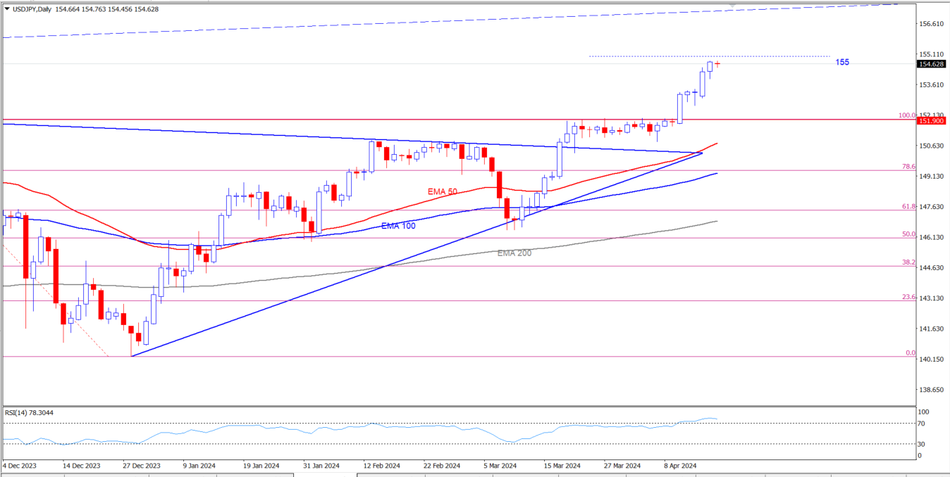 2- تحركات زوج الدولار مقابل الين الياباني: زوج الدولار مقابل الين الياباني يتداول بالقرب من أعلى مستوياته منذ 34 عام، حيث افتتح جلسة اليوم عند 154.66 وكان قد سجل أعلى مستوى جديد يوم أمس عند 154.78.