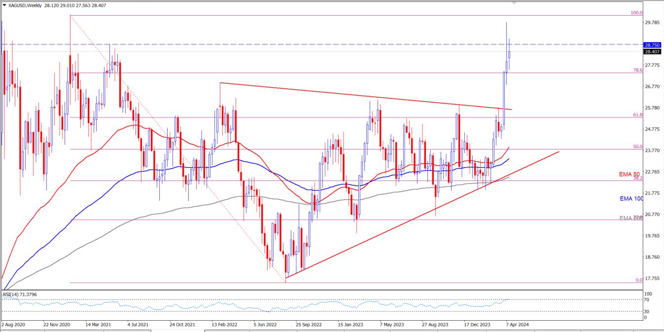 ارتفاع أسعار الذهب لمستويات تاريخية أيضاً ساعد على ارتفاع أسعار الفضة بشكل كبير خلال الفترة الأخيرة، لتقترب حالياً من المستوى 30 دولار للأونصة، ولكن حتى الآن فشلت أسعار الفضة في تحقيق اغلاق أسبوعي فوق مستوى المقاومة 28.75 دولار للأونصة.