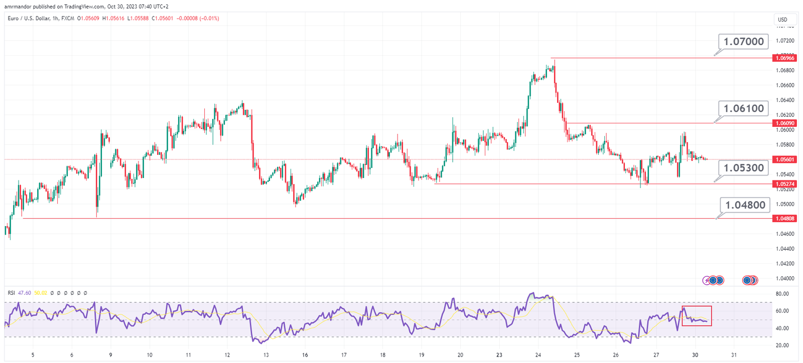 مؤشر القوة النسبية RSI يظهر ضعف في حركة الأسعار بتداول المؤشر حول مستويات 50 مما يدعم احتمالية صعود الأسعار لاستهداف مستويات المقاومة 1.0610، و التي من المتوقع رؤية سلوك سعري سلبي حول هذة المستويات لاستهداف مستويات الدعم 1.0530.
