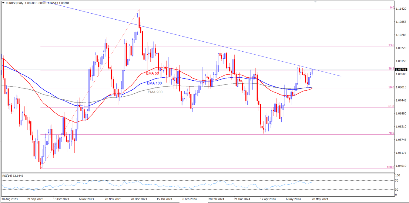 اليورو ارتفع للجلسة الثالثة على التوالي مقابل الدولار الضعيف، وذلك على الرغم من توقعات البنك المركزي الأوروبي بالبدء في خفض أسعار الفائدة خلال اجتماعه القادم في يونيو، والذي أكده توقعات تراجع التضخم من قبل المستهلكين اليوم.