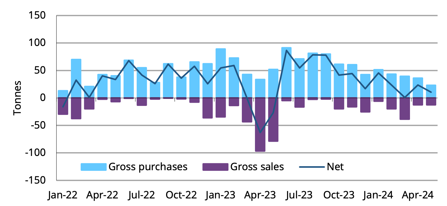 البيانات تظهر استمرار مشتريات البنوك المركزية العالمية من الذهب منذ بداية عام 2024 ولكن إجمالي المشتريات والمبيعات قد تراجع مقارنة مع الفترة نفسها من العام الماضي، وتظل الأسواق الناشئة هي القوة الأساسية في البيع والشراء.