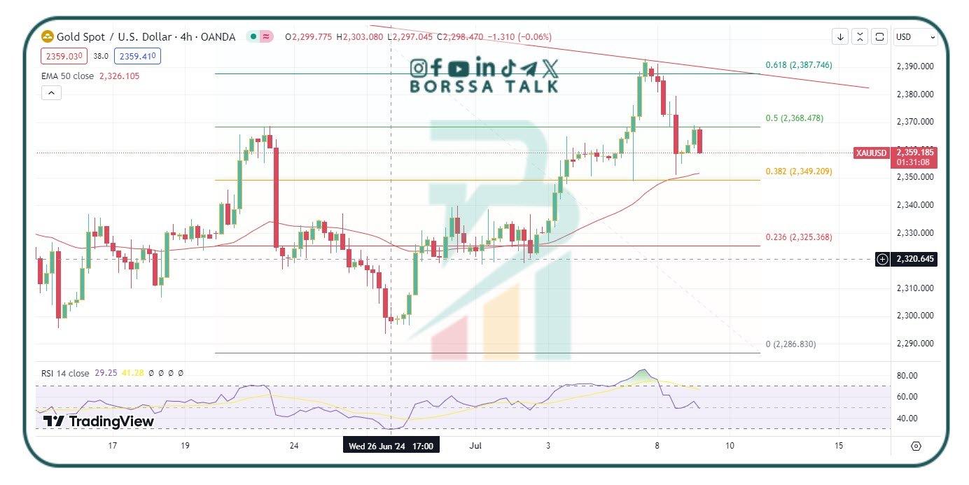 بعد أن ارتفع سعر الذهب الفوري نهاية الأسبوع الماضي ليغلق فوق المستوى 2390 دولار للأونصة انخفض يوم أمس بشكل كبير ليعود إلى مستوى الدعم الرئيسي في المنطقة حالياً عند 2350 دولار للأونصة والذي يمثل المتوسط المتحرك 50 لمدى زمني 4 ساعات كما يمثل المستوى التصحيحي 38.2%.