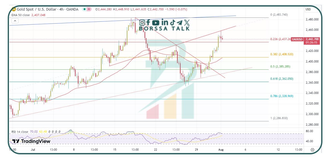 حقق الذهب المستهدف الأول بالوصول إلى منطقة 2440 – 2450 دولار للأونصة، ليتداول حالياً فوق المستوى التصحيحي 23.6% حول المستوى 2440 دولار للأونصة، ولكنه واجه خط مقاومة صاعد قصير الأجل عند المستوى 2460 دولار للأونصة أجبره على التراجع بعض الشيء.