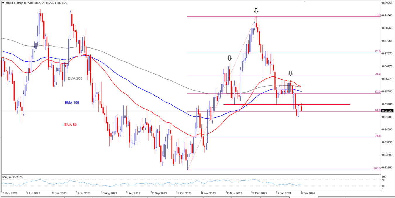 الرسم البياني اليومي يظهر تكون نموذج الرأس والكتفين واختراق السعر لخط الرقبة ليبدأ في الهبوط ولكنه فشل في اختراق المستوى التصحيحي 61.8% عند 0.6500 ليعود إلى إعادة اختبار خط الرقبة حول المستوى 0.6525.