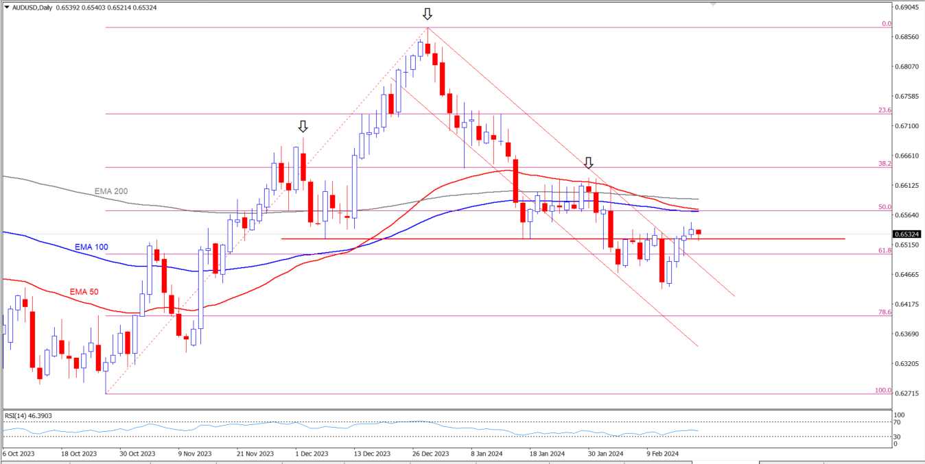 يأتي هذا بعد أن ارتفع الزوج يوم أمس وسجل أعلى مستوى في أسبوعين عند 0.6551 ليتداول الزوج فوق مستوى الدعم 0.6522 الذي يمثل خط الرقبة لنموذج الرأس والكتفين والذي كان السعر قد كسره ليبدأ في تحقيق المستهدف الهابط للنموذج من خلال التحرك في قناة سعرية هابطة.