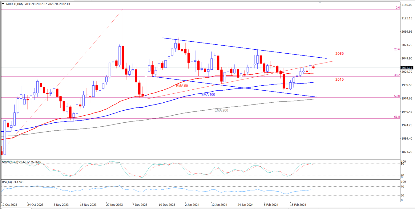 بشكل عام تبقى معظم تداولات الذهب منذ بداية العام في منطقة بين 2000 – 2050 دولار للأونصة، وقد استطاع الذهب أن يغلق تداولات الأسبوع الماضي فوق المستوى 2030 دولار للأونصة ليزيد من فرص الصعود، ولكن التداولات الضعيفة اليوم في ظل غياب البيانات الاقتصادية لم يعطي فرصة للذهب للارتفاع.
