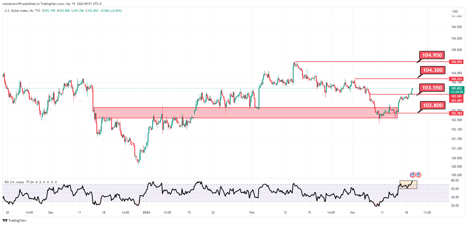 مؤشر القوة النسبية RSI يتداول أعلى مستويات 70 و هي مستويات التشبع الشرائي ، مما يدعم استمرار الاتجاه الصاعد واستهداف مستويات المقاومة 104.30 و التي باختراقها و الثبات أعلاها نستهدف مستويات المقاومة التالية 104.95.