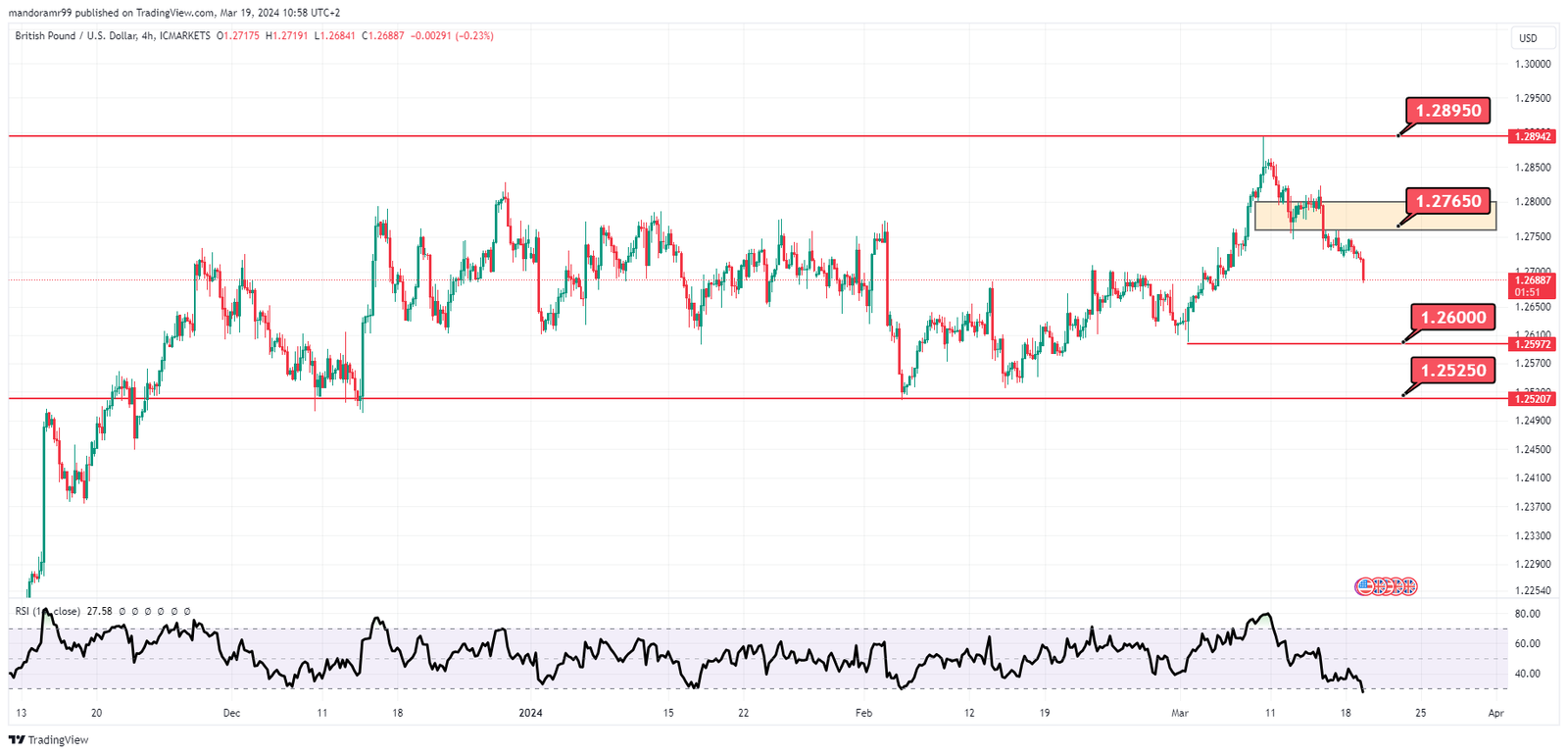 مؤشر القوة النسبية RSI يتحرك أسفل مستويات 30 و هي مستويات التشبع البيعي ، لذلك نتوقع فنيا استمرار الاتجاه الهابط و استهداف مستويات الدعم 1.2600 و التي بكسرها والثبات أسفلها نستهدف مستويات الدعم التالية 1.2525.