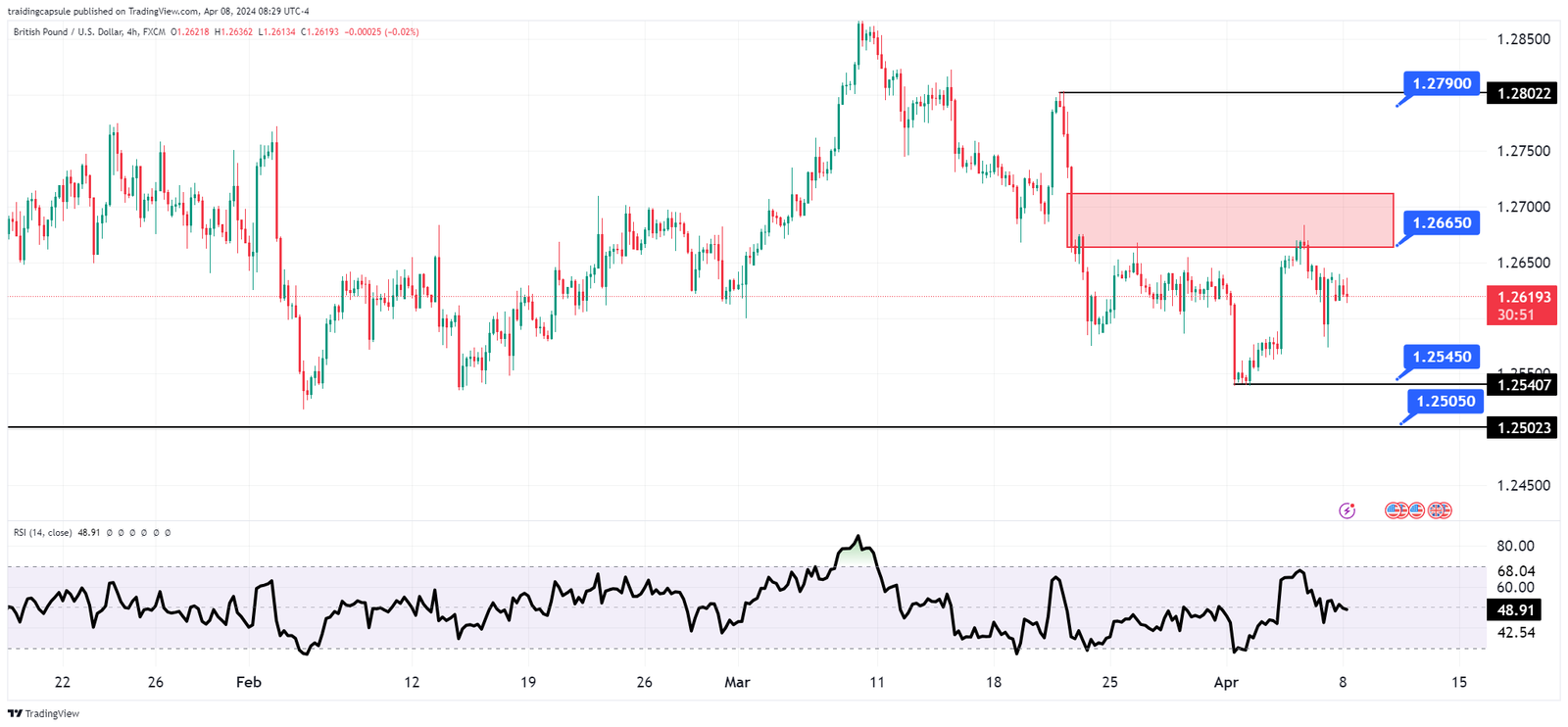 مؤشر القوة النسبية RSI ارتد لاسفل من مستويات 70 و هي مستويات التشبع الشرائي، لذلك نتوقع فنيا استمرار الحركة التصحيحية الهابطة لاستهداف مستويات الدعم 1.2545 ثم مستويات الدعم التالية 1.2505.