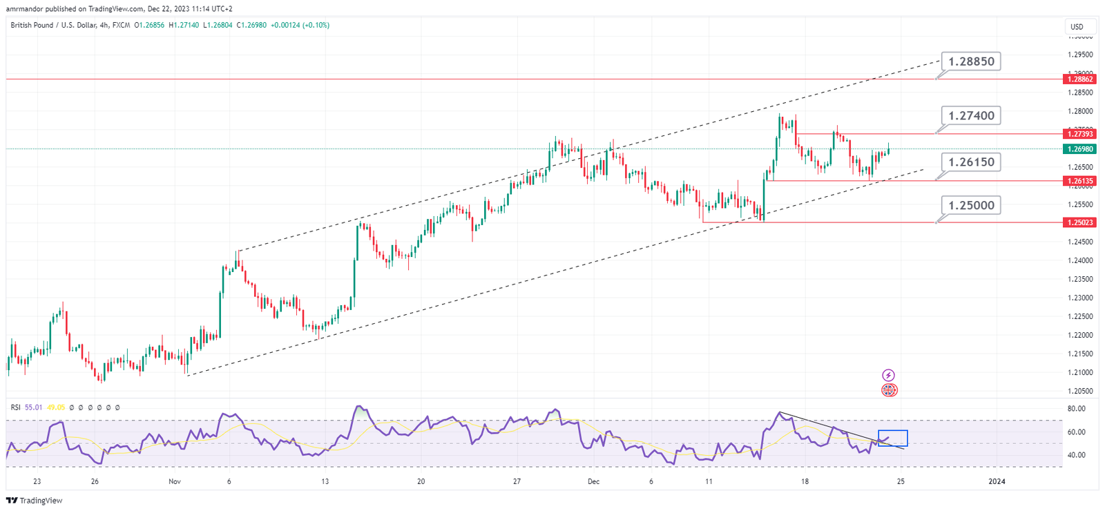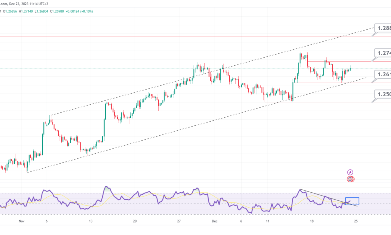 مؤشر القوة النسبية RSI ارتد لأعلى من خط الاتجاه الهابط بعد اختراقه، لذلك نرجح فنيا احتمالية استمرار الحركة التصحيحة الصاعدة حيث أنه باختراق مستويات المقاومة 1.2740 و الثبات أعلاها، تنتهي الحركة العرضية و نبدا في اتجاه صاعد لنستهدف بذلك مستويات المقاومة التالية 1.2885.