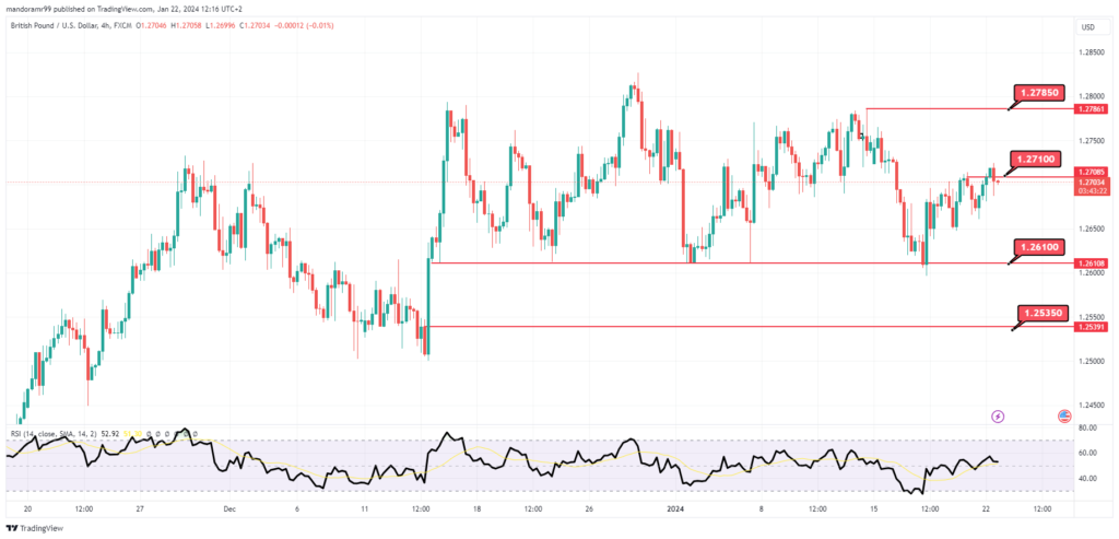 مؤشر RSI يظهر التداول حول مستويات 50، مما يدعم احتمالية التراجع من المستويات الحالية لاستهداف مستويات 1.2650 ثم مستويات الدعم 1.2610.