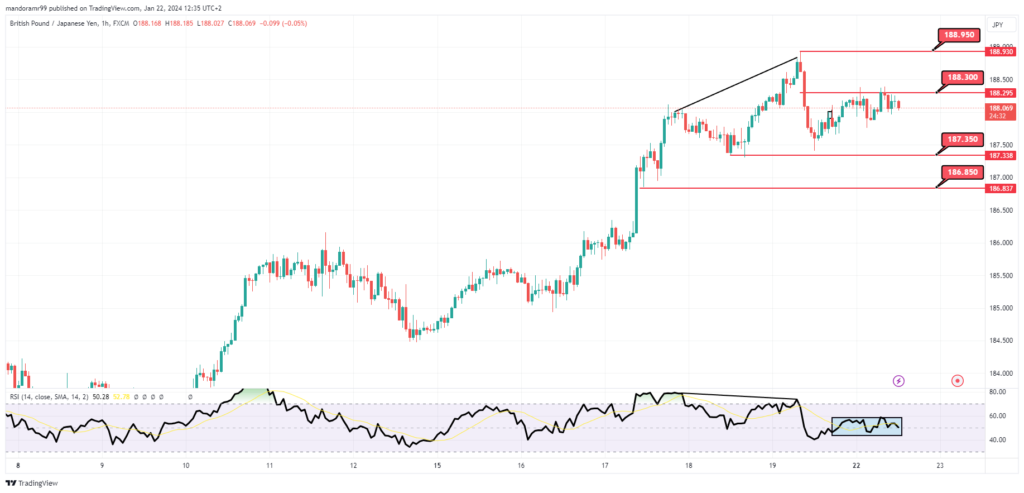 يظهر مؤشر القوة النسبية RSI وجود انفراج سلبي و تداول أيضا بشكل عرضي حول مستويات 50، لذلك نتوقع التراجع حتى مستويات الدعم 187.35 و التي بكسرها و الثبات أسفلها نستهدف مستويات الدعم التالية 186.85.