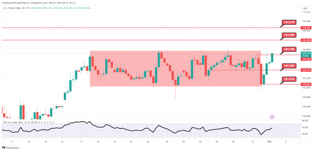 يتحرك مؤشر الدولار الأمريكي في حركة عرضية على إطار الأربع ساعات. وارتدت الأسعار لأعلى من مستويات الدعم 103.07 و التي تمثل الحد السفلي للحركة العرضية. وتتداول الاسعار حاليا حول مستويات المقاومة 103.70. بعد تثبيت أسعار الفائدة الامريكية أمس الأربعاء، صعدت الأسعار بقوة و ذلك بسبب تصريحات جيروم باول و التي وصفت بالتشددية إلى حد ما. حيث أنه ما زال يرى أن أسواق العمل لازالت قوية، و أن أعضاء الفيدرالي الأمريكي غير واثقين من قرار خفض أسعار الفائدة في الوقت الحالي.و تترقب الاسواق اليوم بيانات إعانات البطالة الأمريكية و بيانات مؤشر مديري المشتريات التصنيعي الصادر عن ISM. هذه الأخبار ستؤثر على تحركات الدولار الأمريكي خلال اليوم.