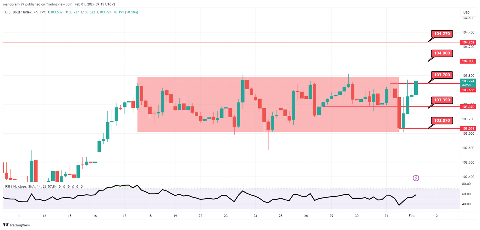 يتحرك مؤشر الدولار الأمريكي في حركة عرضية على إطار الأربع ساعات. وارتدت الأسعار لأعلى من مستويات الدعم 103.07 و التي تمثل الحد السفلي للحركة العرضية. وتتداول الاسعار حاليا حول مستويات المقاومة 103.70. بعد تثبيت أسعار الفائدة الامريكية أمس الأربعاء، صعدت الأسعار بقوة و ذلك بسبب تصريحات جيروم باول و التي وصفت بالتشددية إلى حد ما. حيث أنه ما زال يرى أن أسواق العمل لازالت قوية، و أن أعضاء الفيدرالي الأمريكي غير واثقين من قرار خفض أسعار الفائدة في الوقت الحالي.و تترقب الاسواق اليوم بيانات إعانات البطالة الأمريكية و بيانات مؤشر مديري المشتريات التصنيعي الصادر عن ISM. هذه الأخبار ستؤثر على تحركات الدولار الأمريكي خلال اليوم.