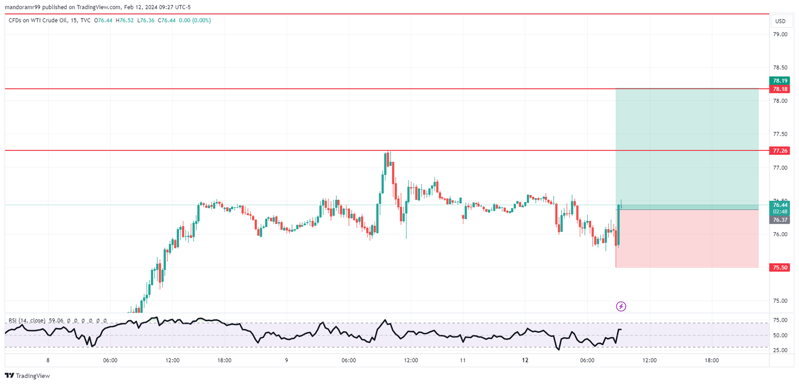 يتحرك النفط في حركة عرضية على اطار الساعة، و اتجاه صاعد عللى اطار الأربع ساعات. و ارتدت الاسعار لأعلى بقوة من منطقة الدعم 75.50 و التي تمثل مستوى دعم قوي على اطار الساعة.